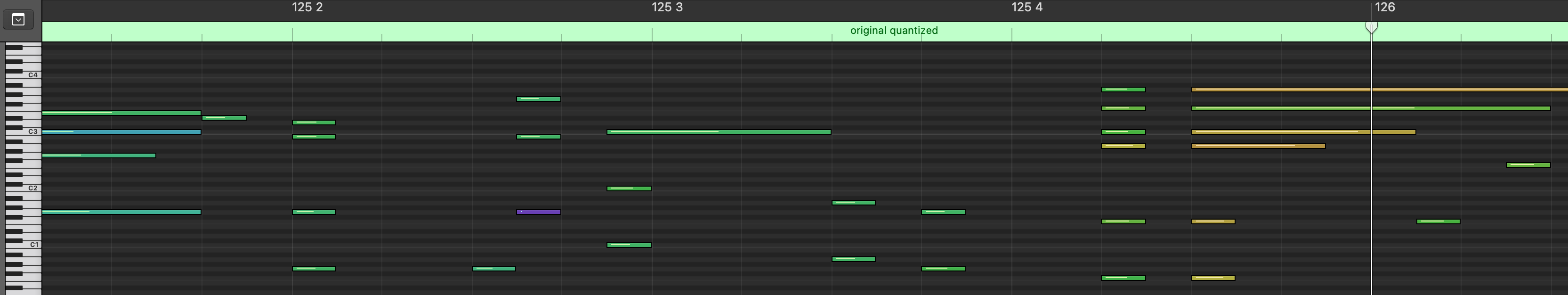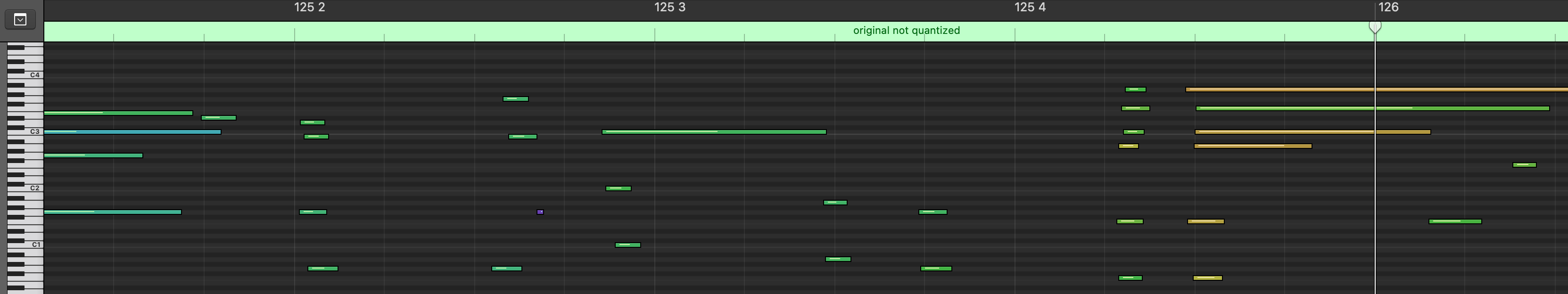 Original MIDI file from the Maestro dataset with a 4/4 time signature. The numbers at the top indicate the bar number (125) followed by the beat number within the bar.¶