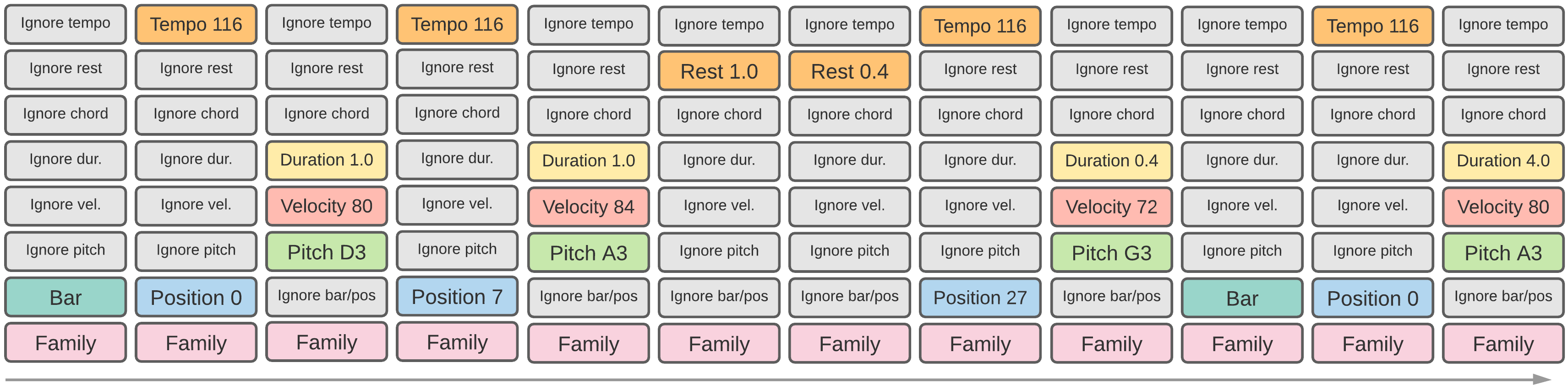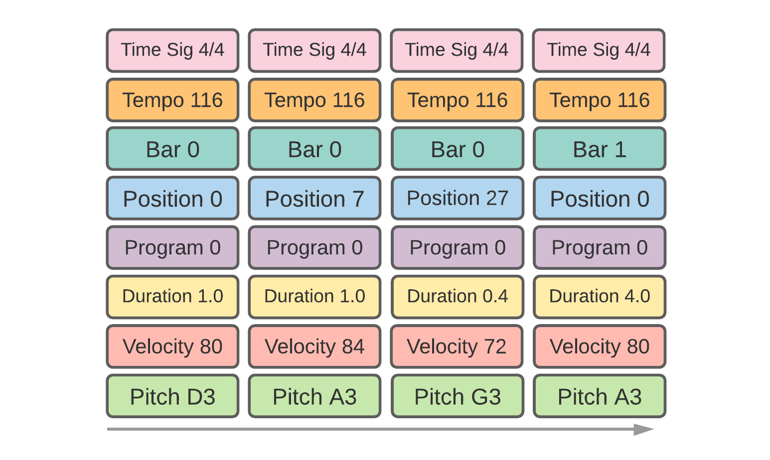 - As the time signature is carried simultaneously with the note tokens, if a Time