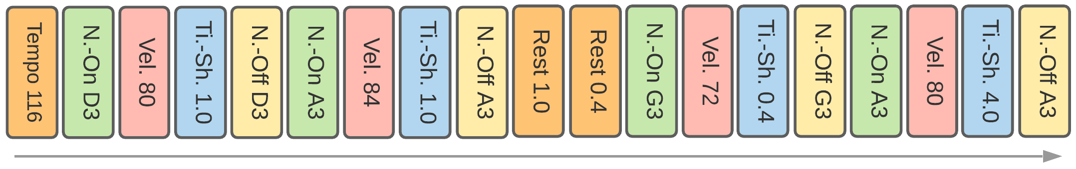 Introduced with the Piano Inpainting Application, it is similar to TSD but is based on a consistent token type successions. Token types always follow the same pattern: Pitch -> Velocity -> Duration -> TimeShift. The latter is set to 0 for simultaneous notes. To keep this property, no additional token can be inserted in MidiTok’s implementation, except Program that can optionally be added preceding